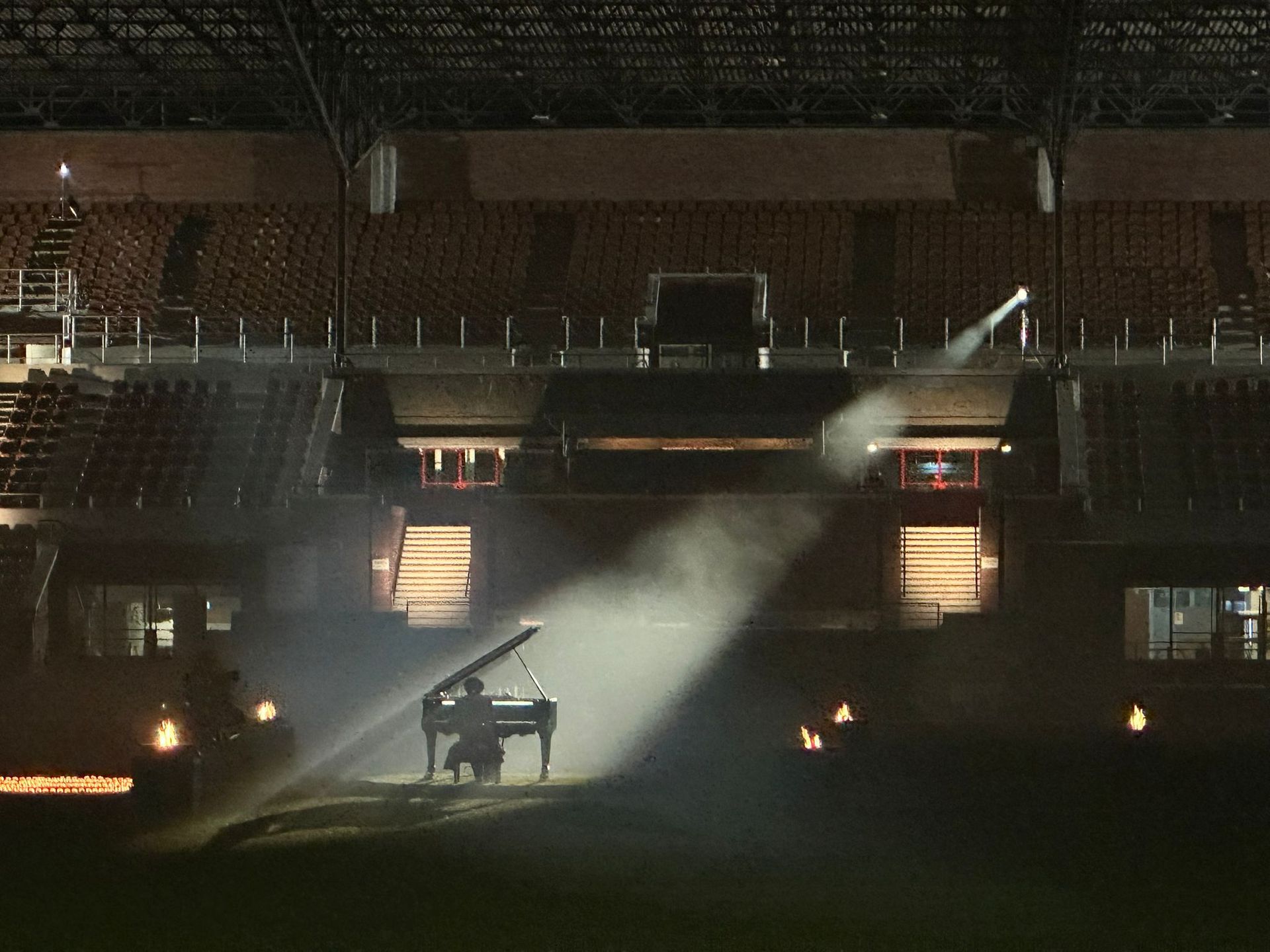 In het midden zat Wibi Soerjadi, achter zijn vleugel, spelend op een manier die het hele stadion (ook al was het leeg) even stil maakte. Rondom hem brandden een cirkel van Icelander vuurtafels, als een moderne ode aan de Olympische vlam. Een bijzonder gezicht: de zachte gloed van de vlammen, het samenspel van muziek en vuur en de serene sfeer die ontstond.